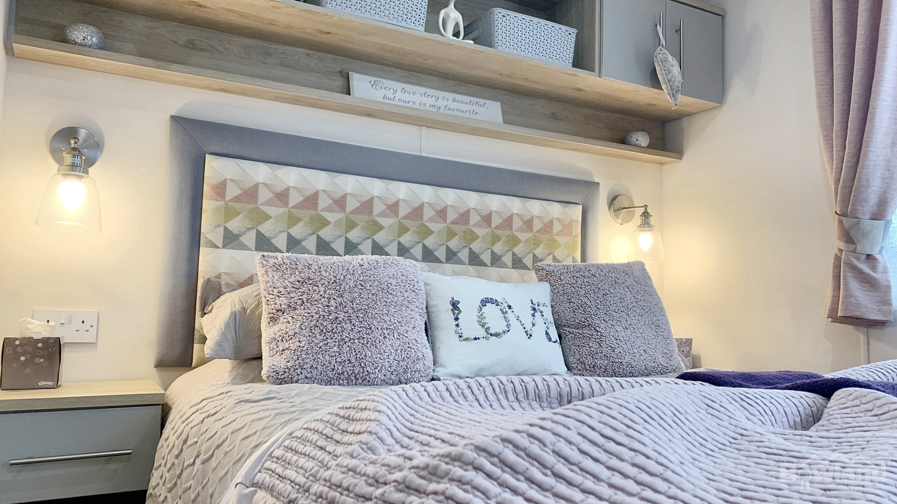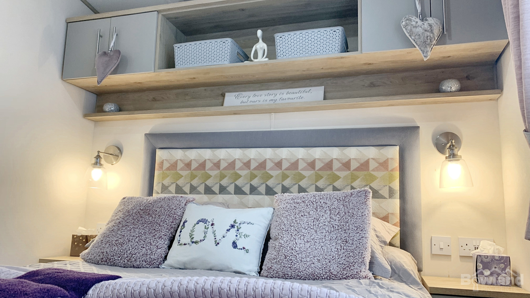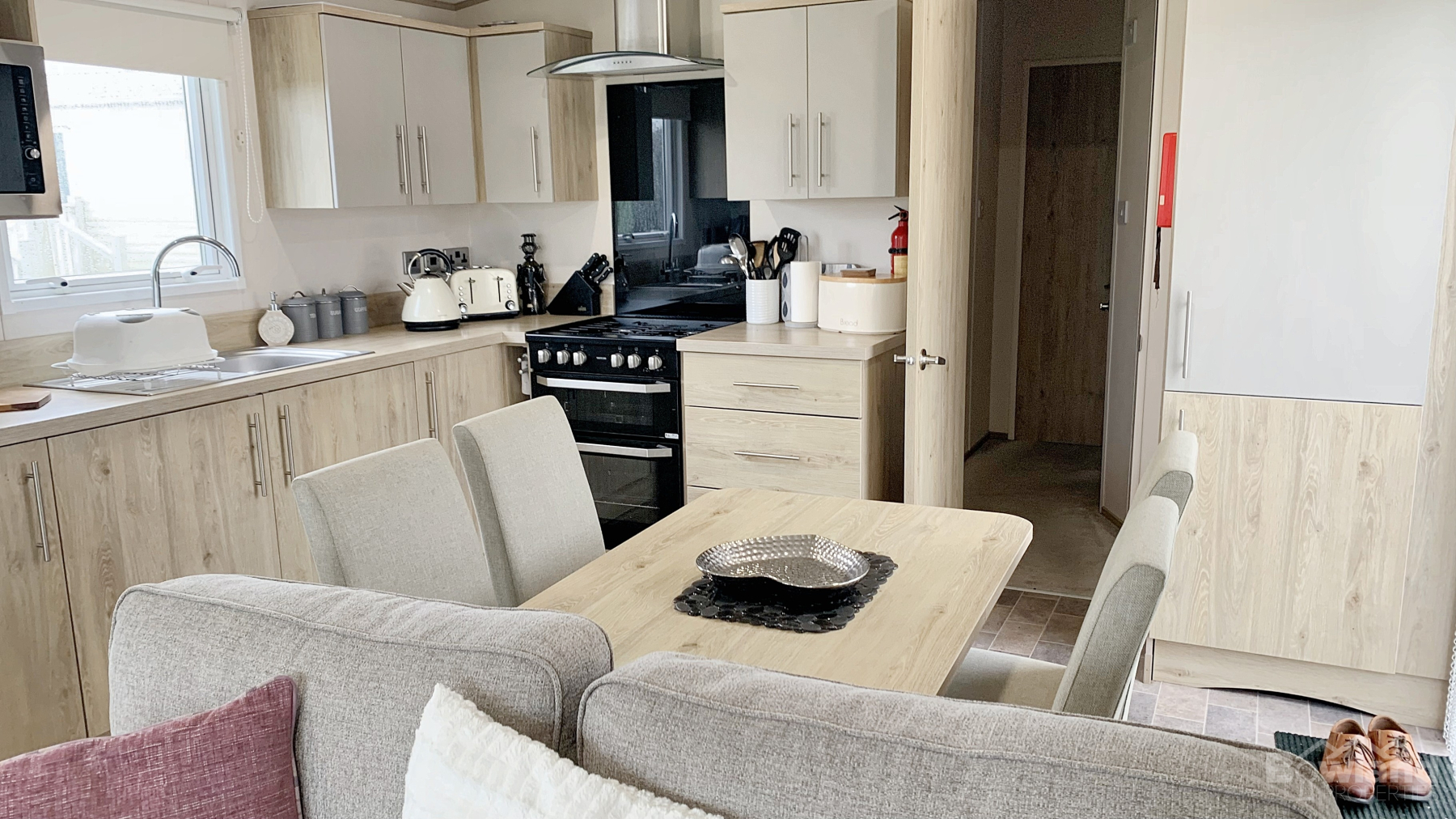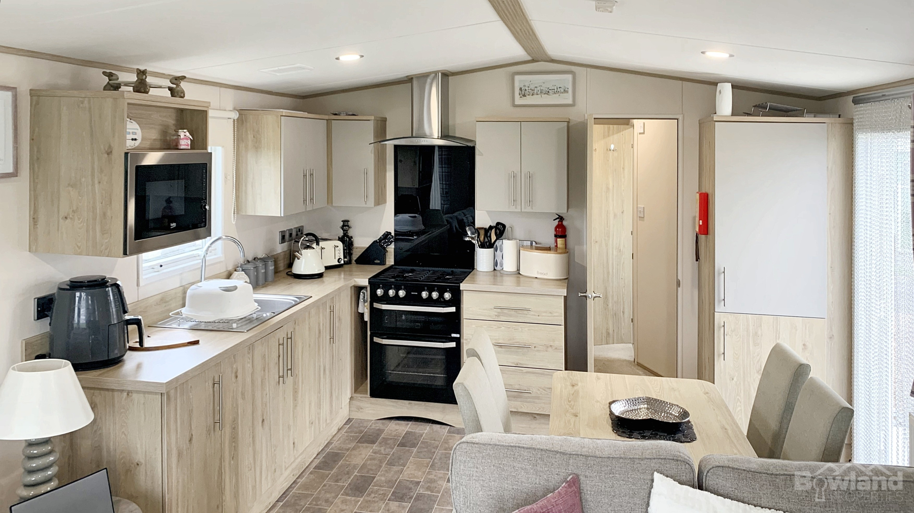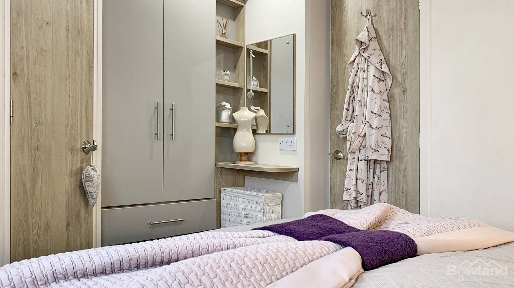 The practical kitchen includes an integrated fridge-freezer, a full cooker, and an extractor hood, providing ample space for preparing meals. Furthermore, the master bedroom offers a king-size bed with convenient lift-up storage, a dedicated dressing area, and a private en-suite toilet.