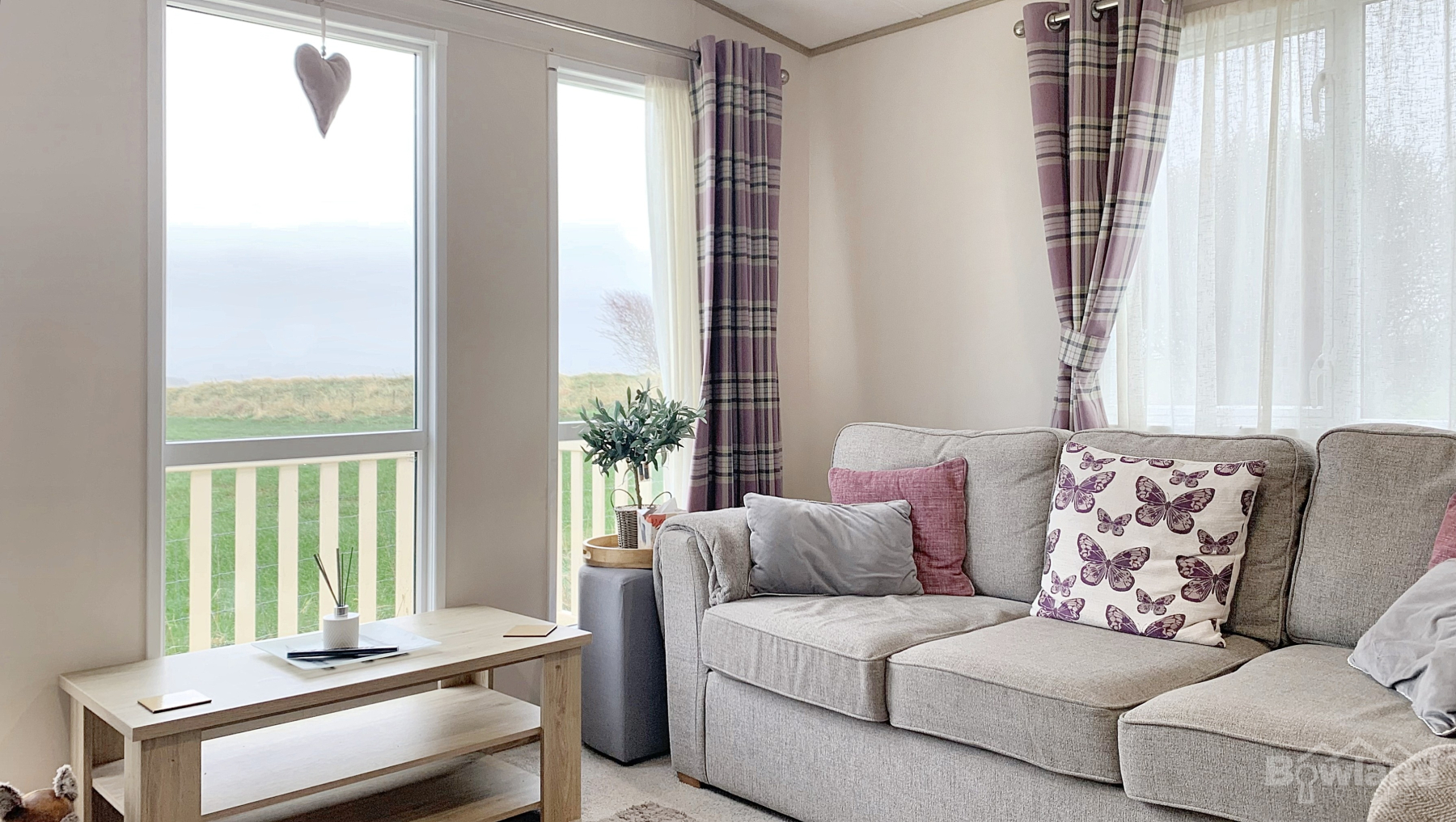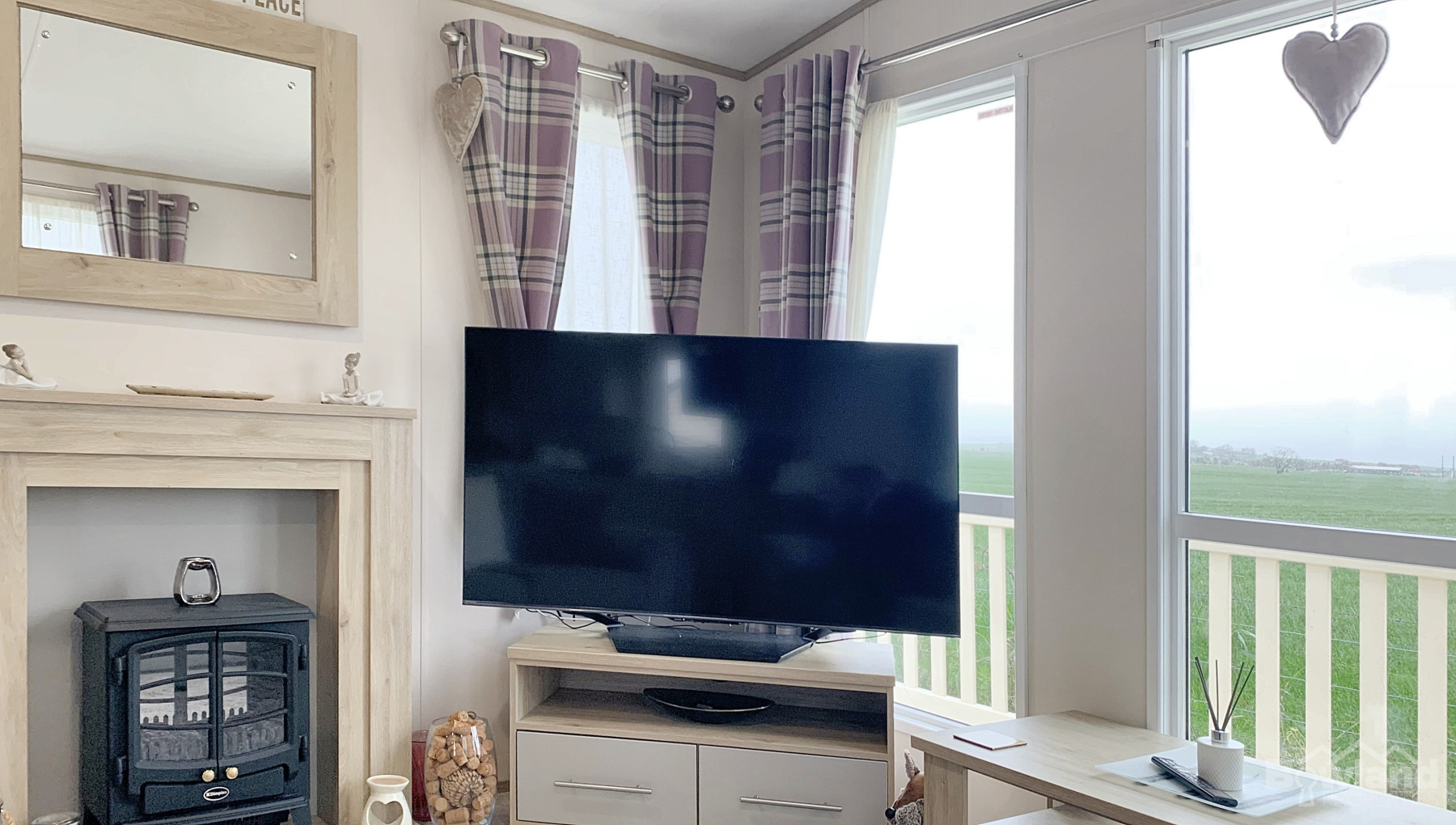 Inside, the spacious open-plan lounge is welcoming and bright, featuring comfortable, free-standing sofas and a contemporary 'wood burner' style electric fire for cozy evenings.