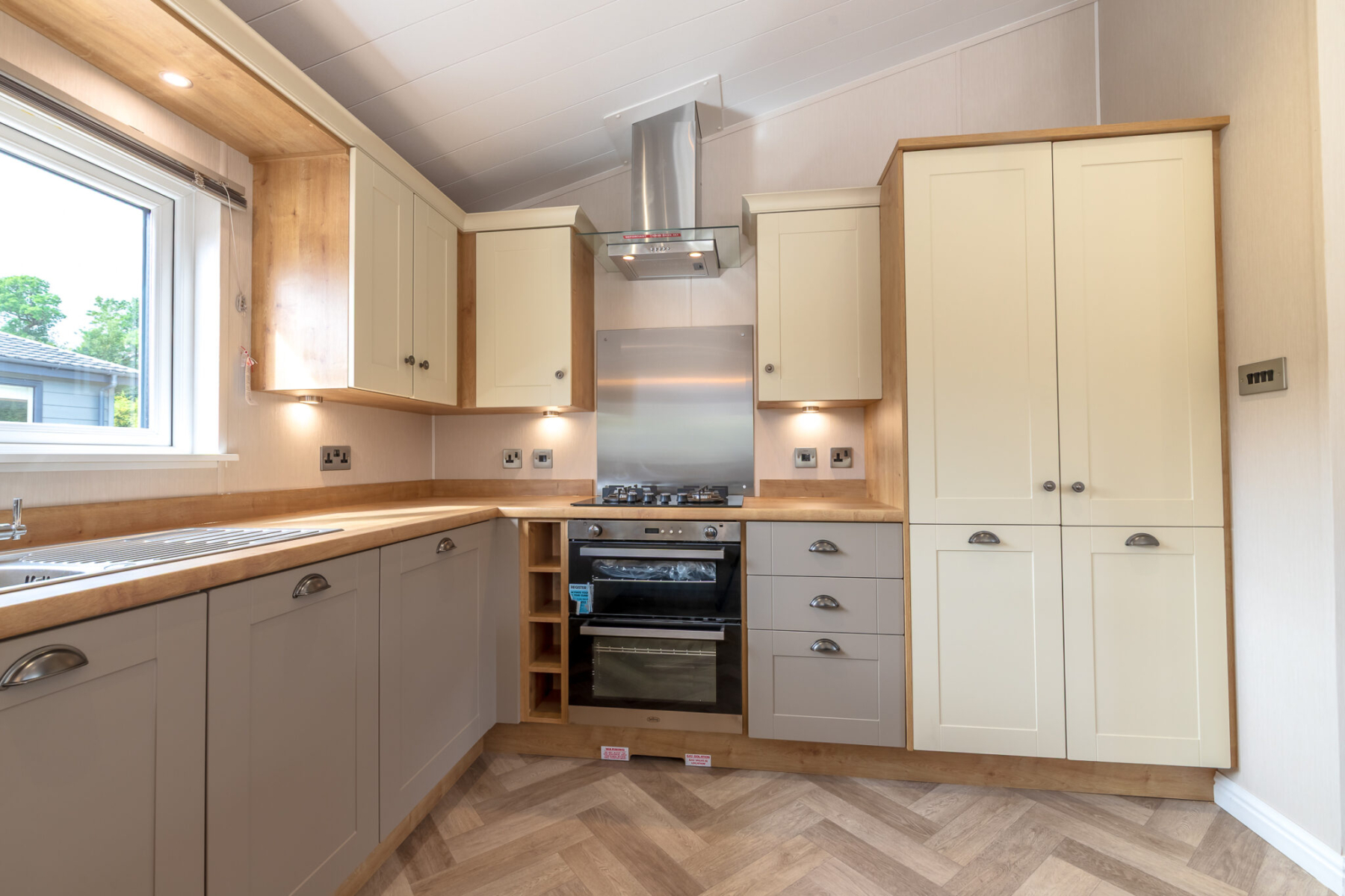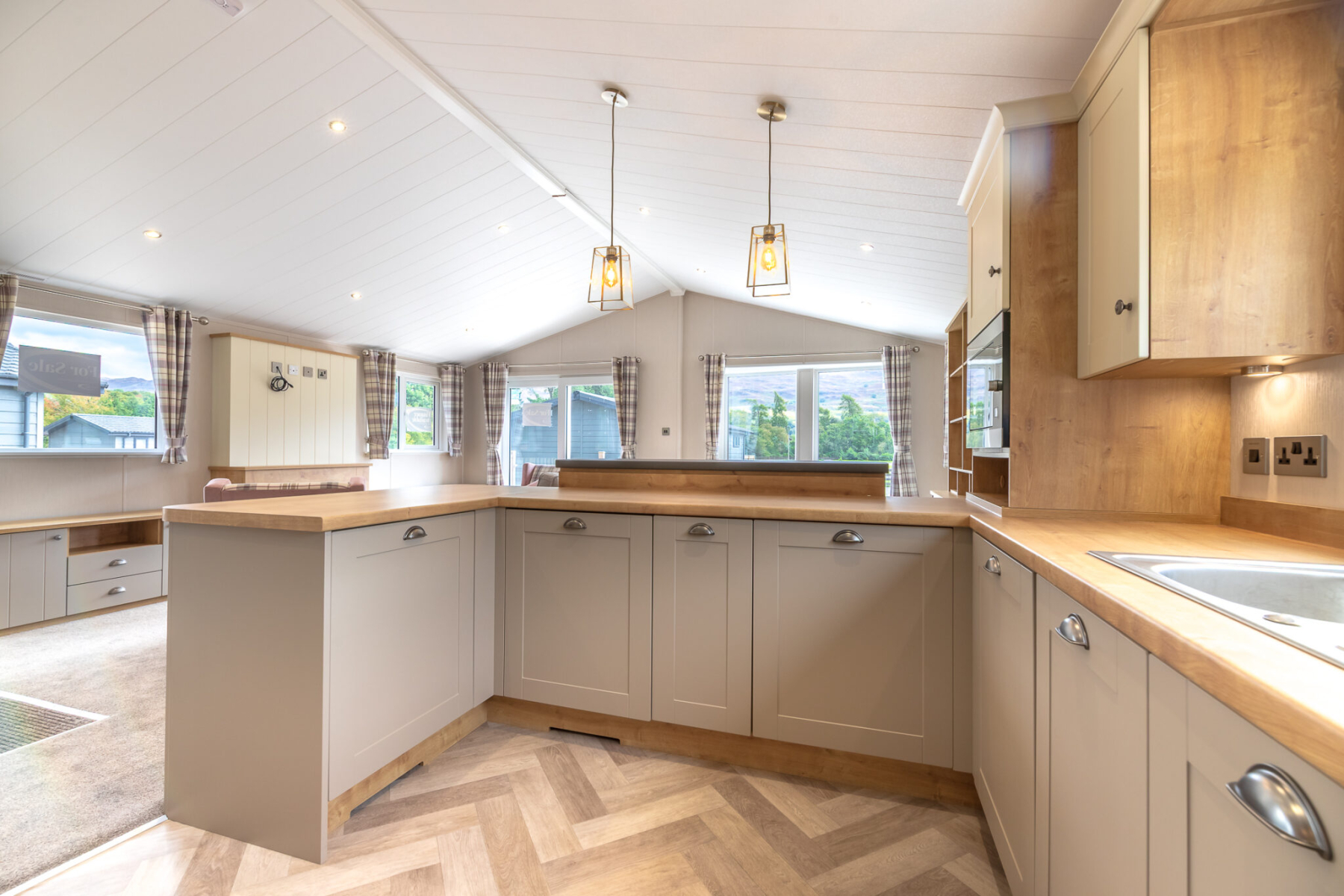 This new Willerby Portland is a stunning 40x20 lodge that defines modern luxury living. It features a classic country house interior with soft blush and oak tones. For example, the huge shaker-style kitchen serves as the heart of the home. This space includes a unique double-width larder and high-end integrated appliances. You will find a washer-dryer, dishwasher, and microwave already installed for your convenience.