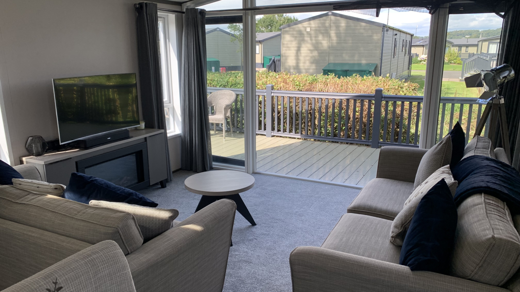 Step inside and be greeted by an elegant, open-plan living space bathed in natural light, thanks to its wide French doors and large windows. The lodge's interior is a harmonious blend of neutral tones and modern wood effects, creating a warm, inviting, and sophisticated atmosphere. The living area is designed for both relaxation and entertaining, featuring free-standing sofas—one of which includes a pull-out bed for extra guests—and an integrated electric fire that provides a cozy focal point on cooler evenings.