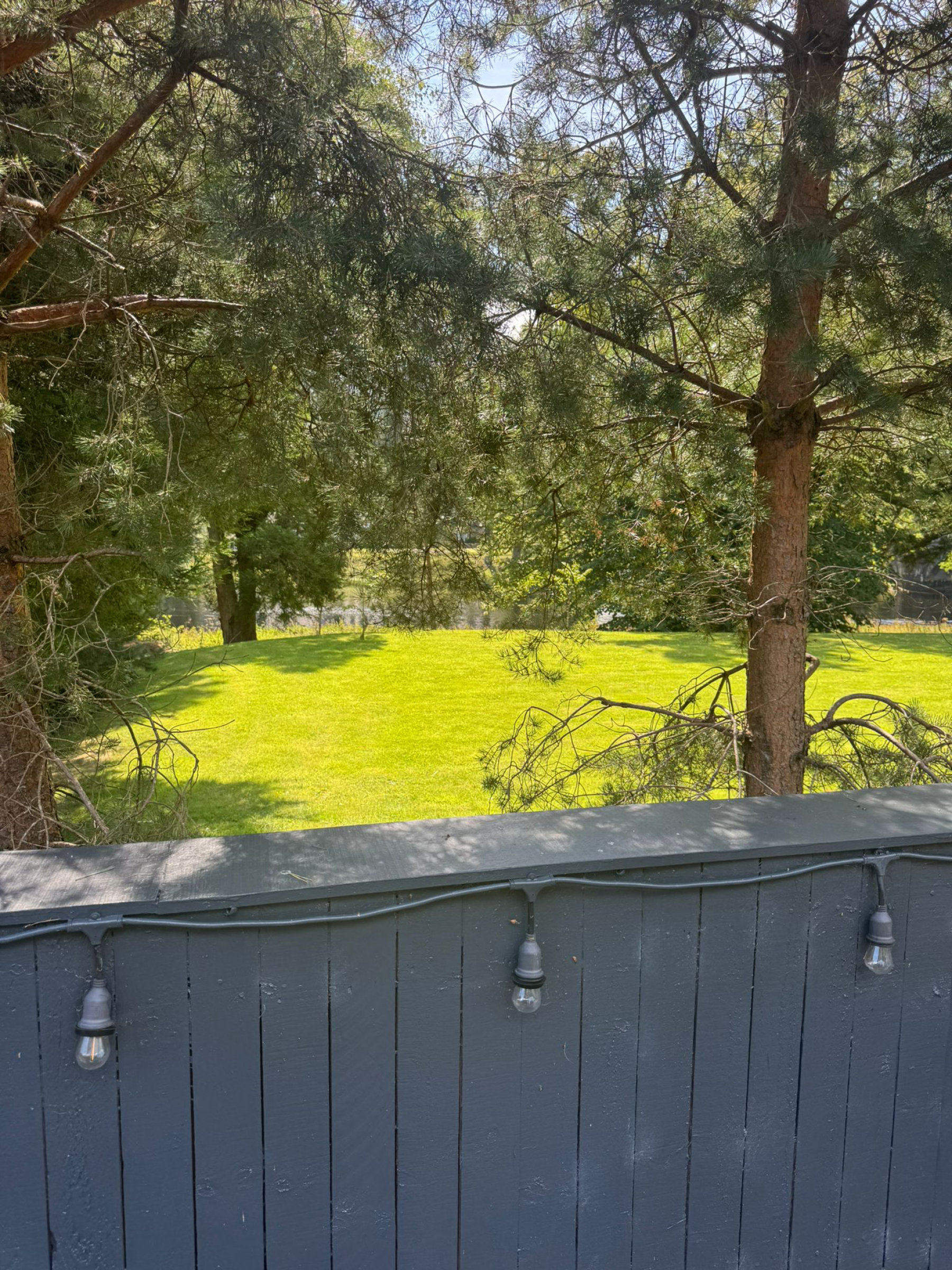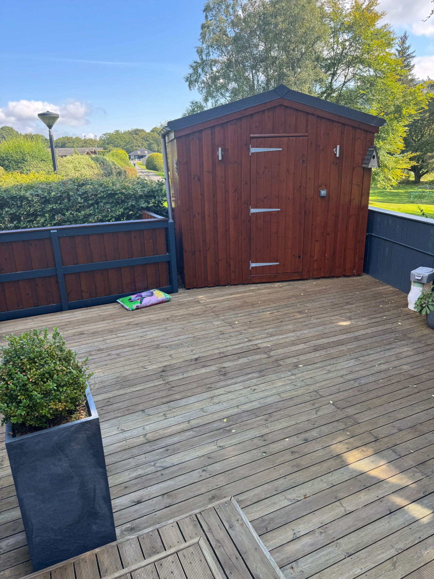 Covered BBQ & large outdoor secure storage for bikes, and seating.
