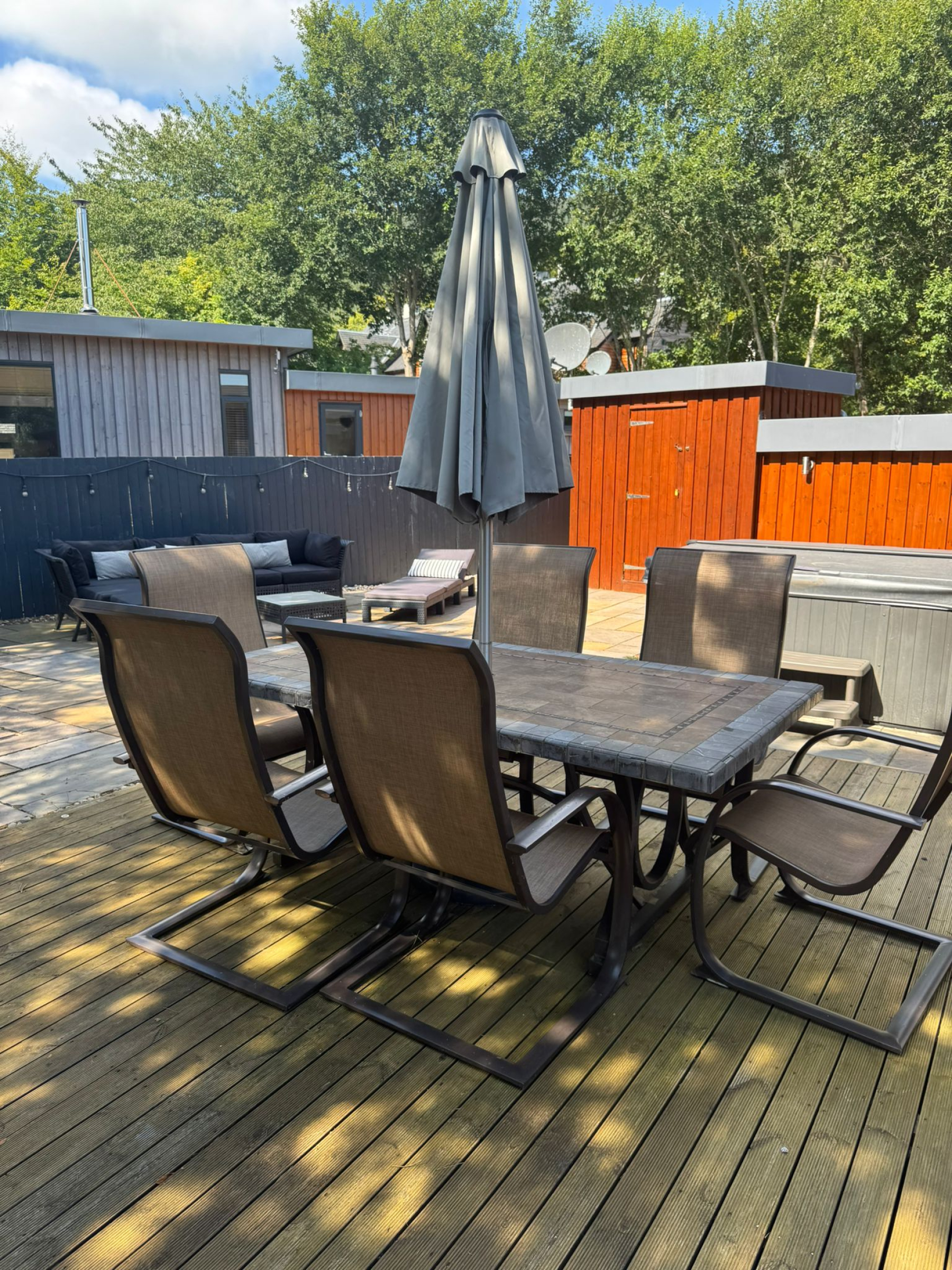 Family dining, large outdoor heated hot tub, sun and social seating area.
