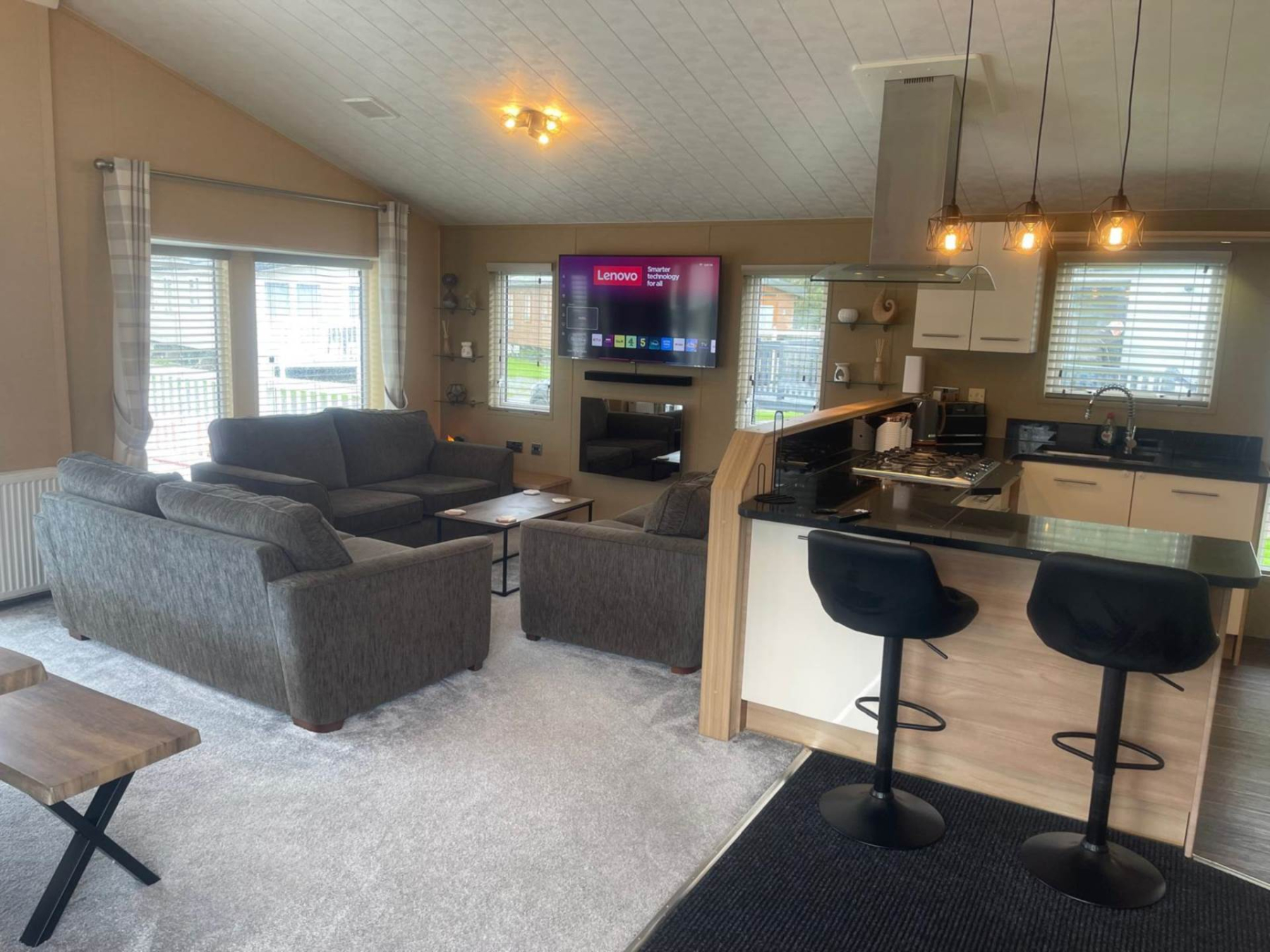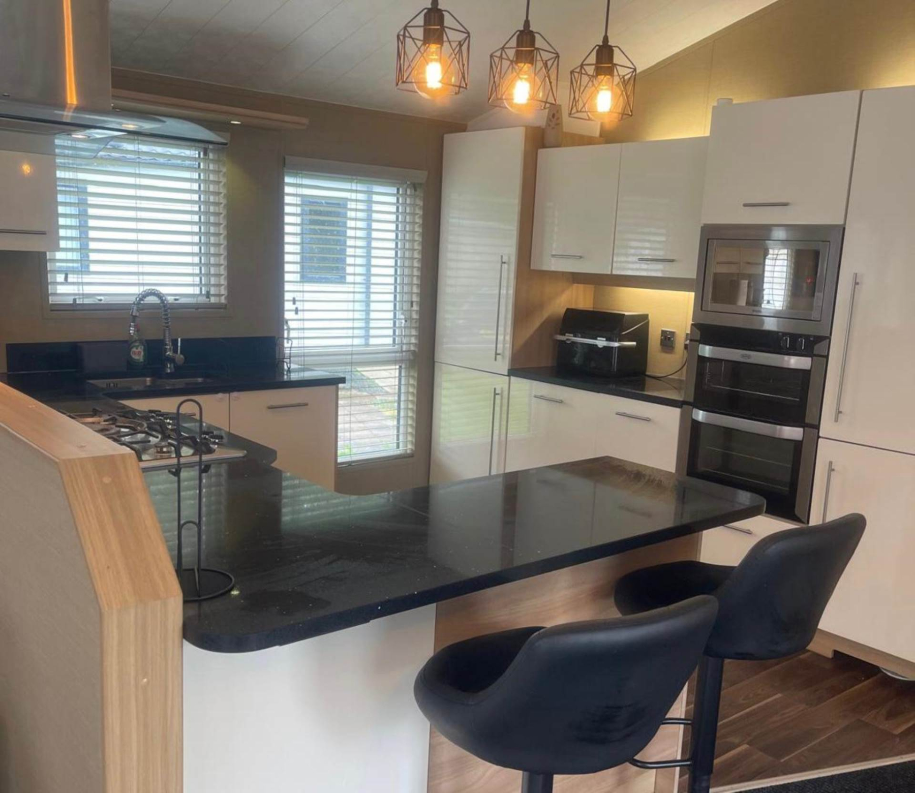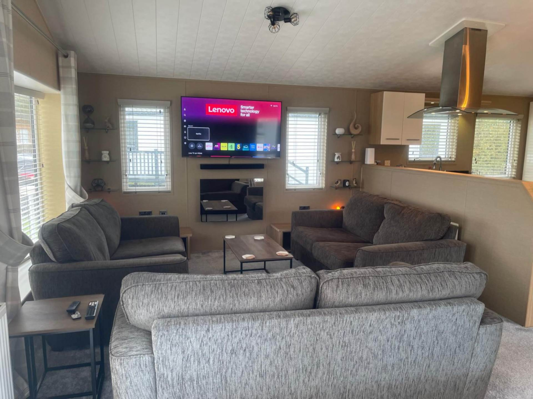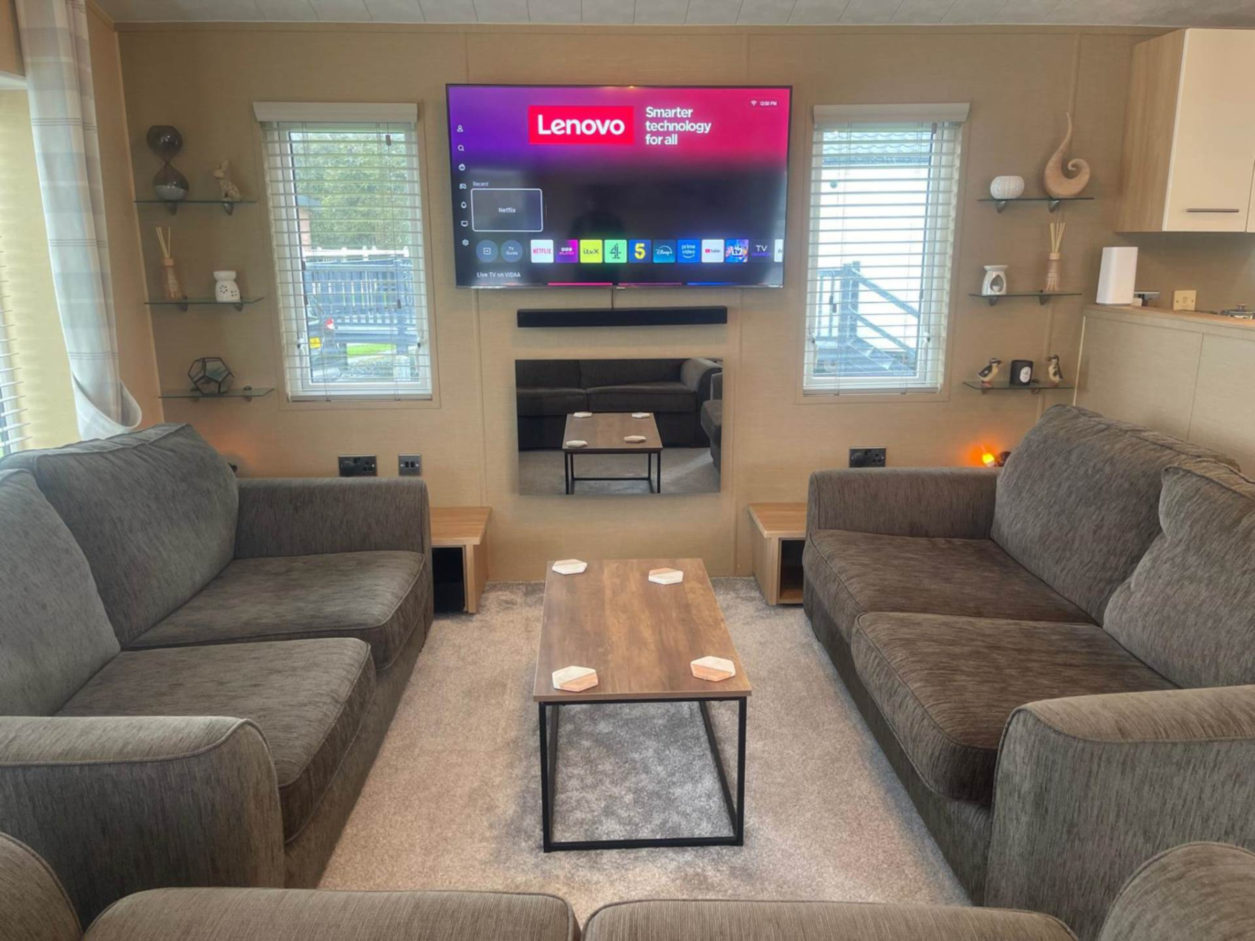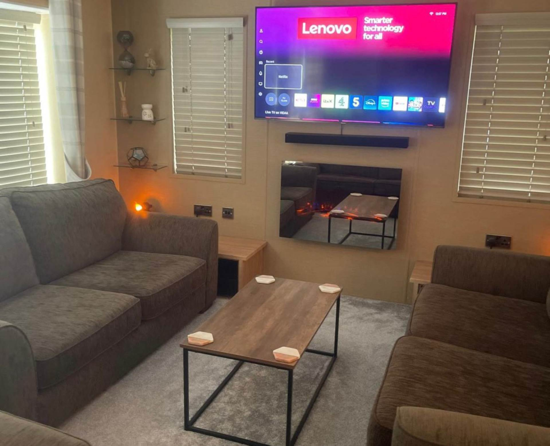 At 40×20 there is plenty of space throughout. The lounge has front opening doors which open out on to an L-shaped decking. With an 10 month season, you can enjoy regular holidays throughout the season! Meanwhile, back inside, there are three two-seater relaxing sofas set around a wall-mounted TV with a stylish electric fire underneath.
