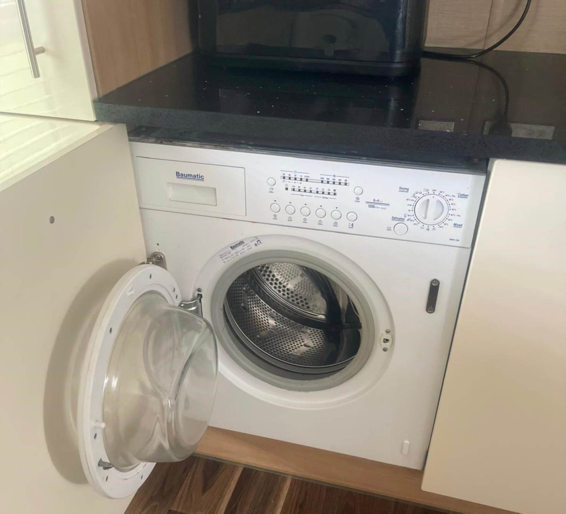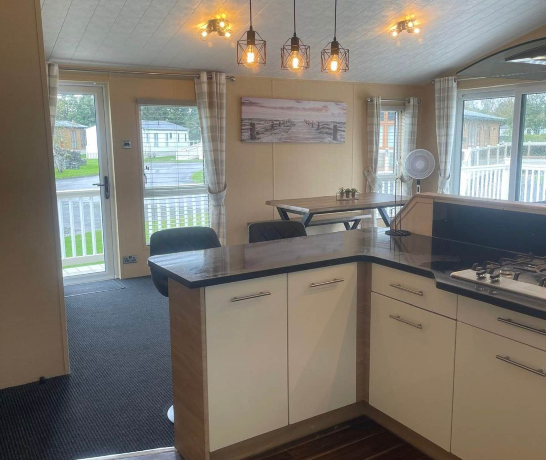 The kitchen is well equipped should you want to cook in your holiday home. There is a U-shaped counters looking over towards the living area and a wall unit behind which means you have a home-from-home kitchen. There is a full wall of cupboards which includes an integrated washing machine and dryer, dishwasher, microwave, grill and oven plus counter space for a toaster and kettle.