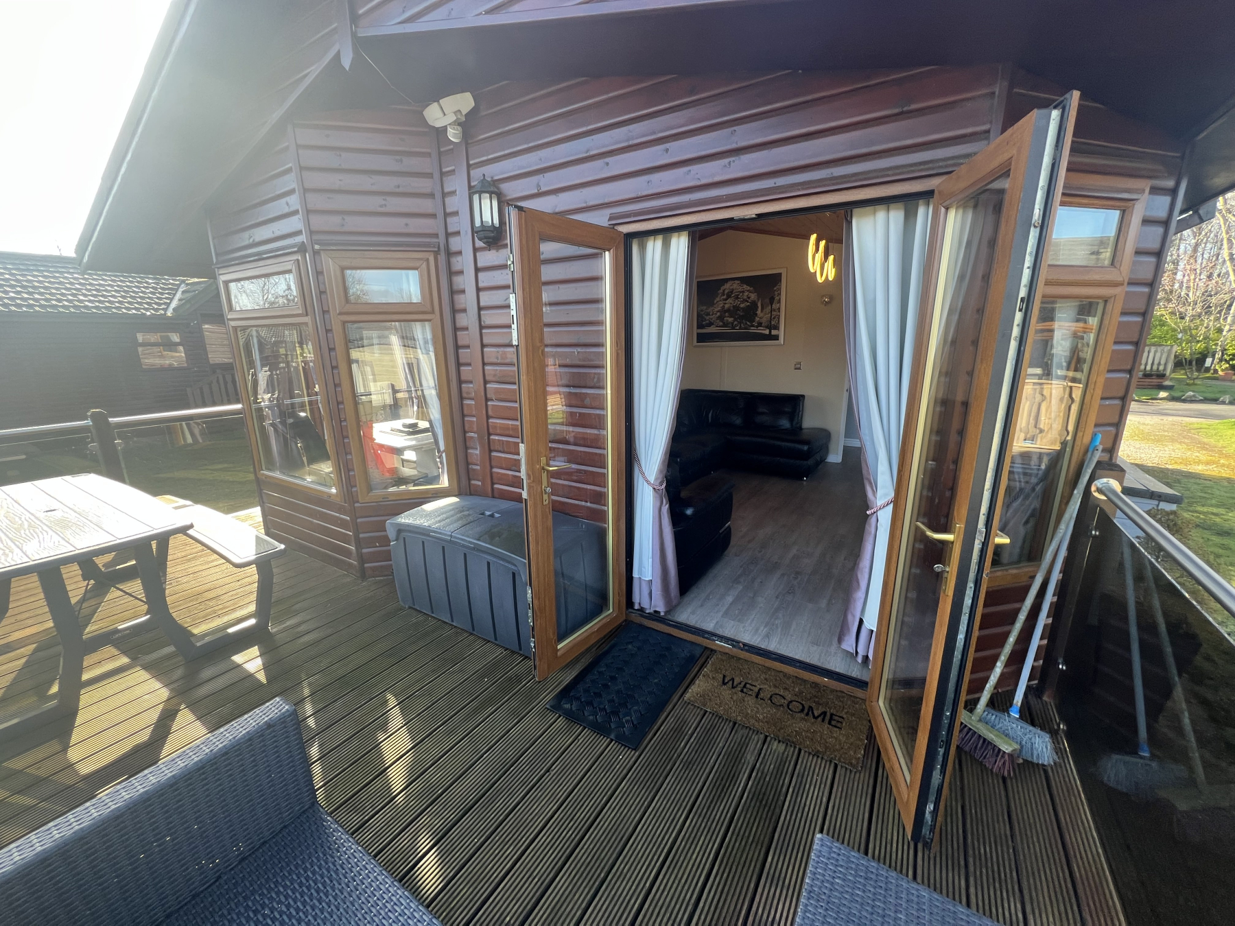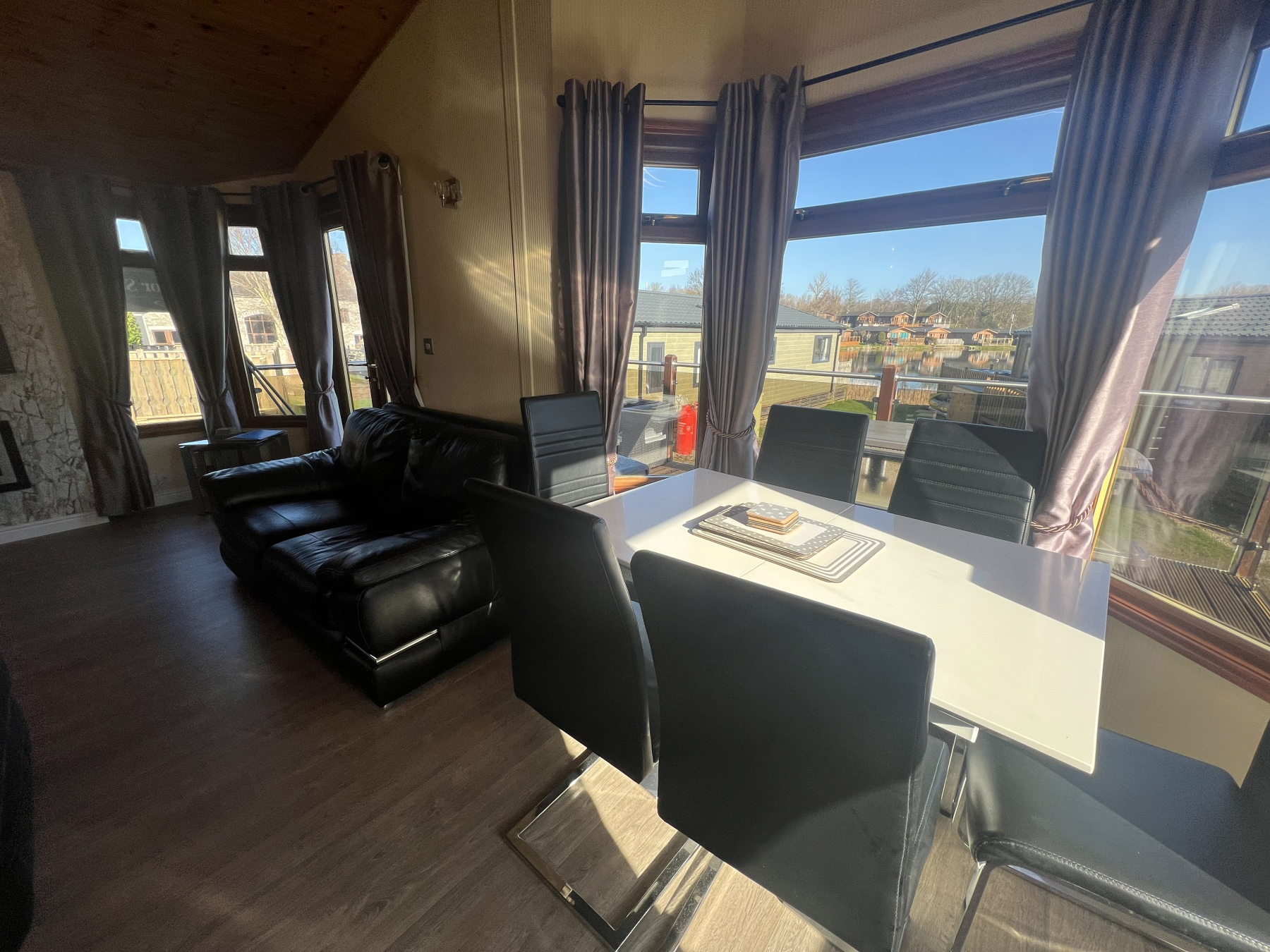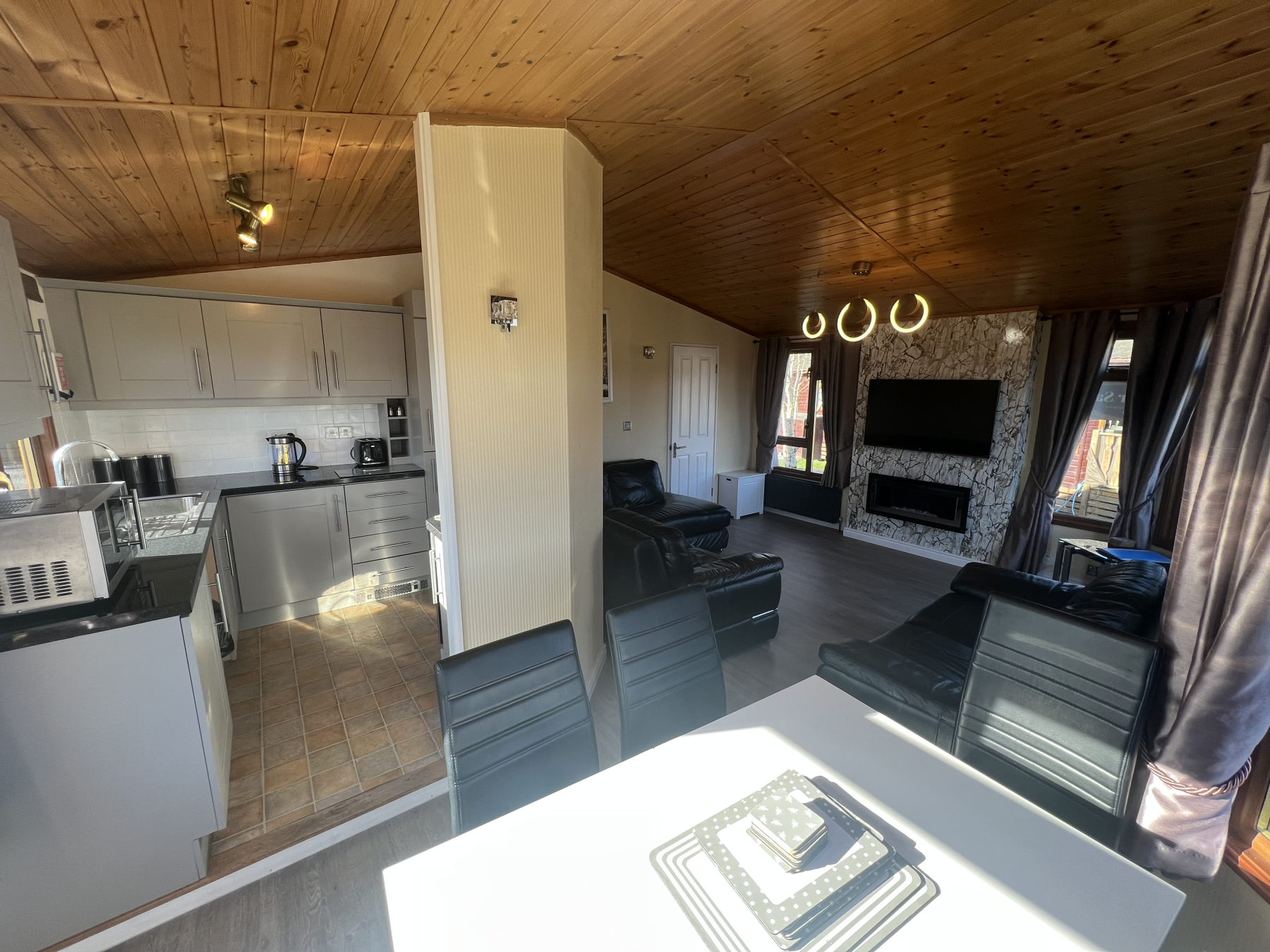 At the heart of the lodge is a sociable open-plan area featuring a designer kitchen equipped with high-gloss cabinetry, gas hob, and premium integrated appliances offering open plan living with plenty of flexible space for relaxing, dining and cooking for a large family. Double French doors opening out on to a sunny timber deck, complete with safety glass panels for an unobstructive view outwards.