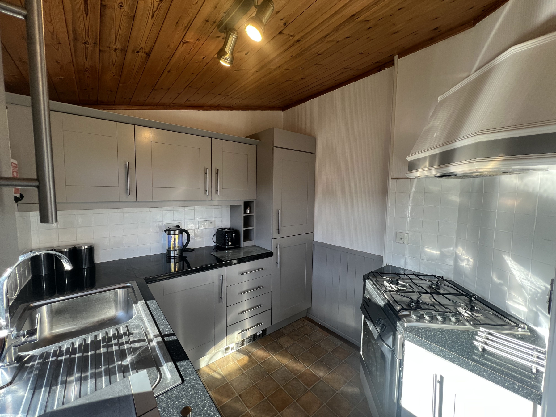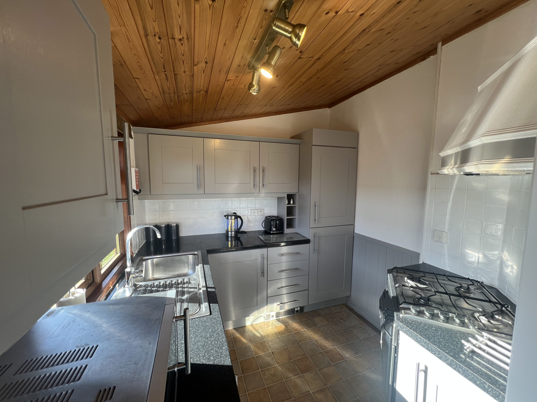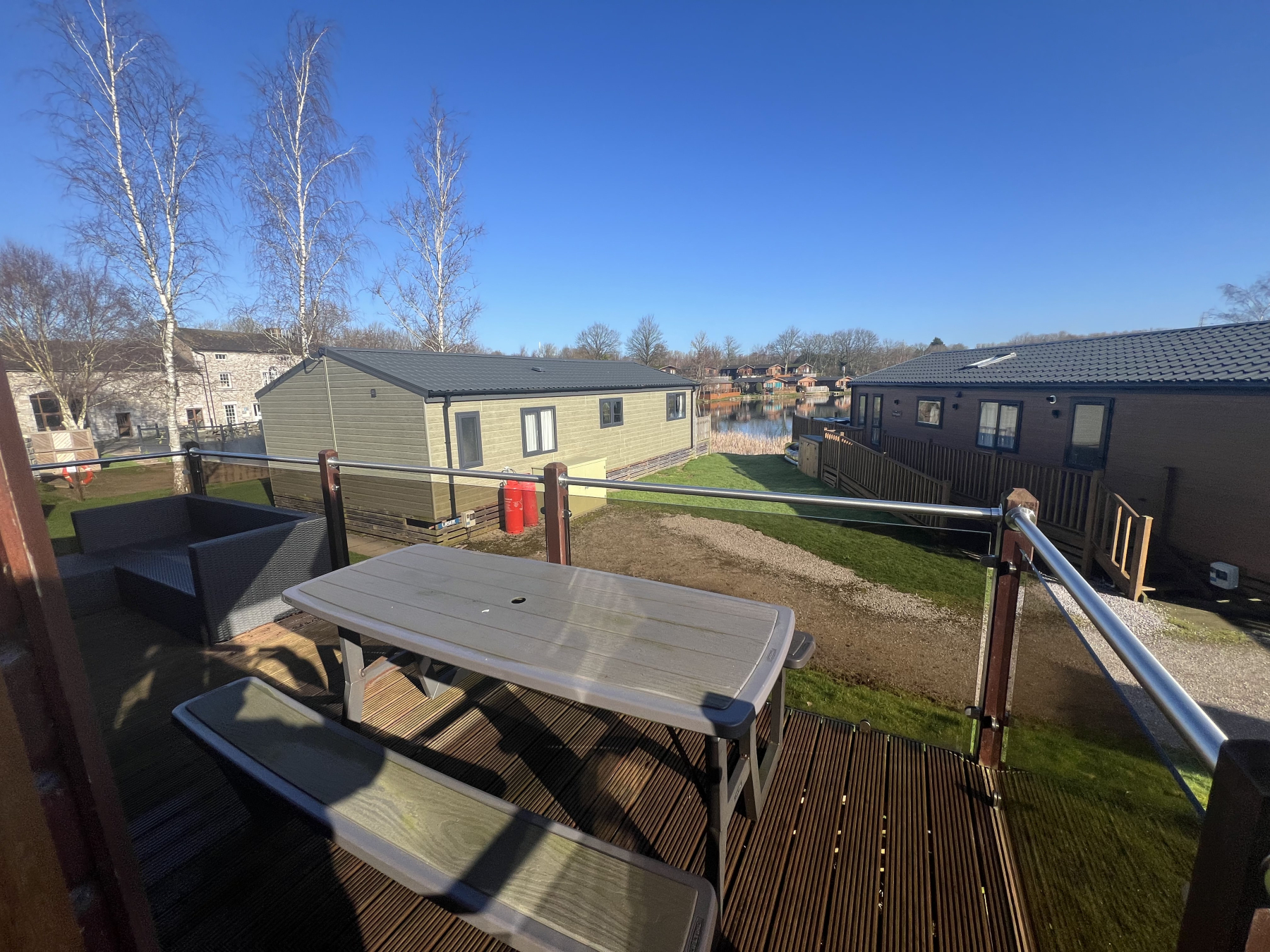 At the heart of the lodge is a sociable open-plan area featuring a designer kitchen equipped with high-gloss cabinetry, gas hob, and premium integrated appliances offering open plan living with plenty of flexible space for relaxing, dining and cooking for a large family. Double French doors opening out on to a sunny timber deck, complete with safety glass panels for an unobstructive view outwards.