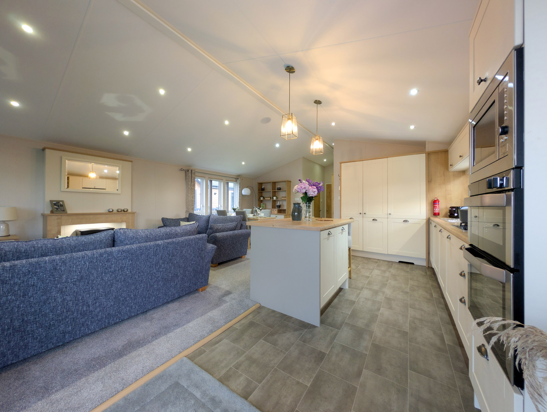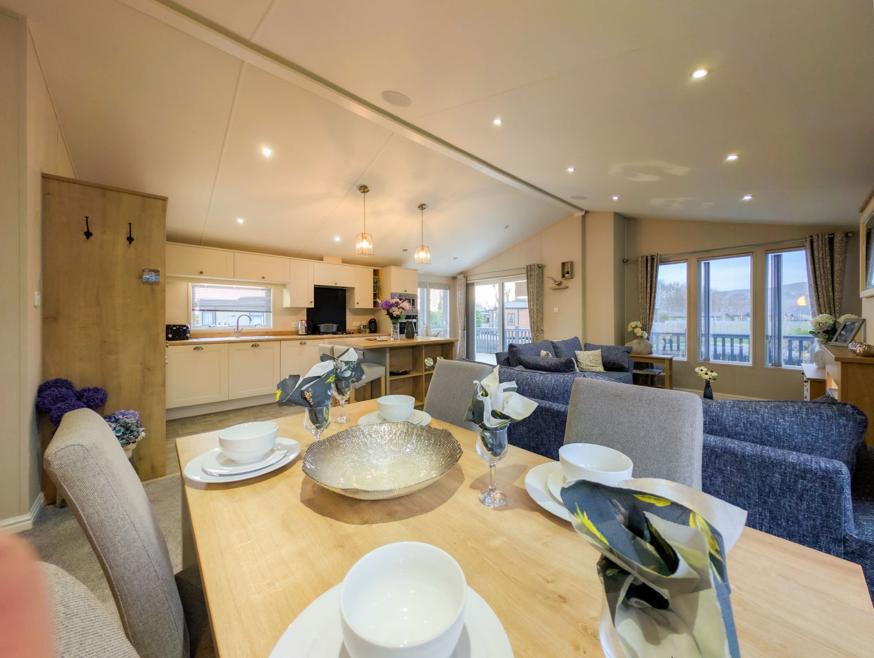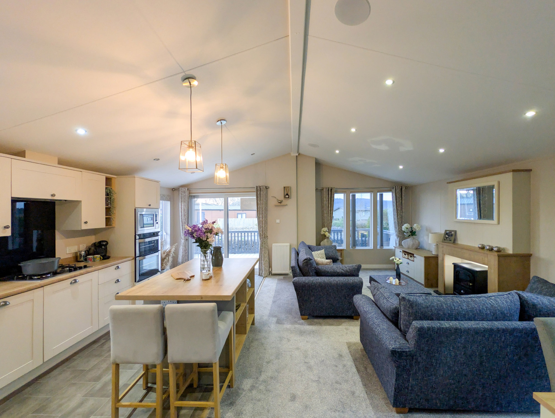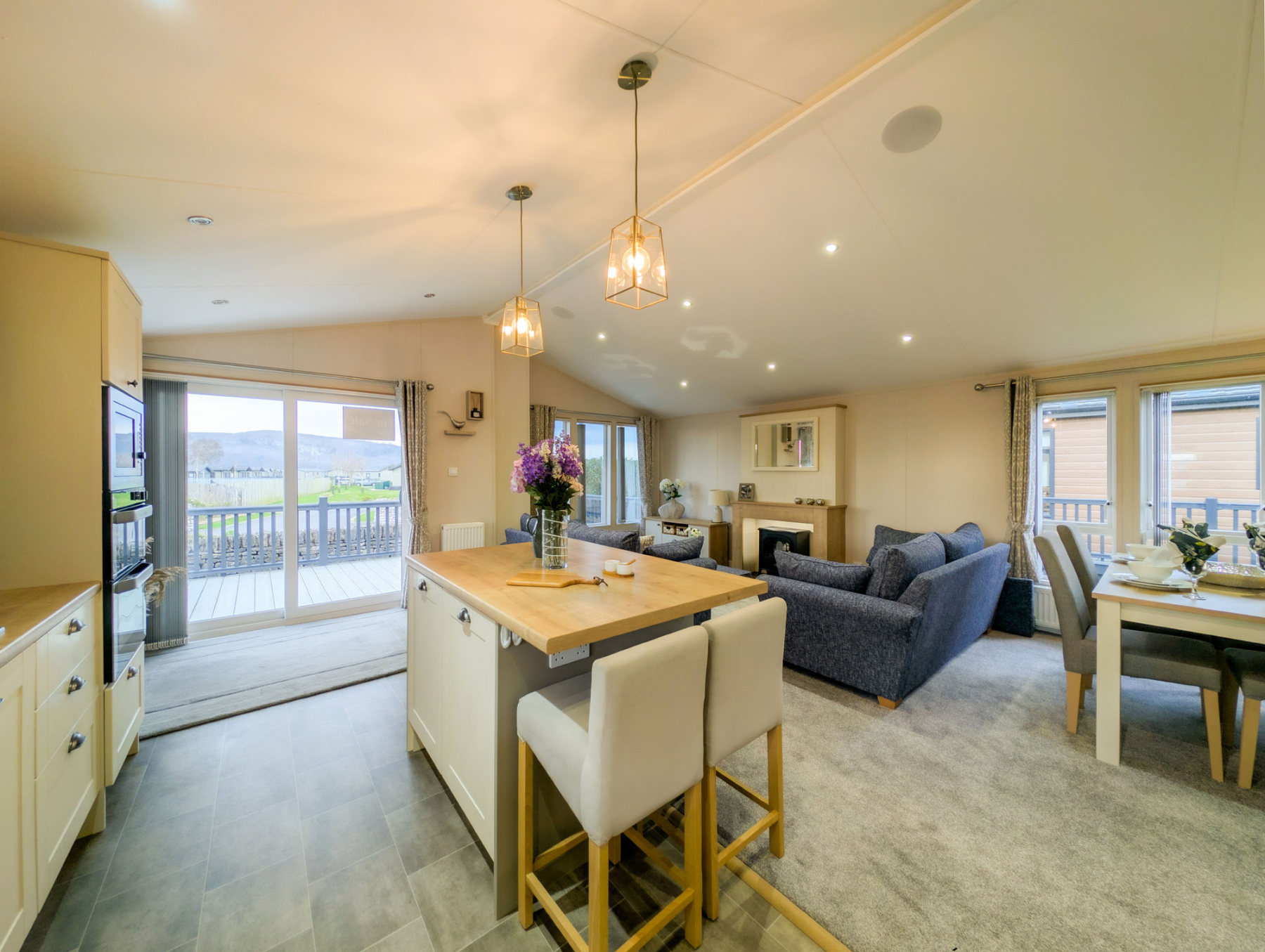 Discover the pinnacle of holiday home luxury with the Willerby Pinehurst lodge. A spacious 40ft x 20ft retreat designed for ultimate comfort and elegance. Offering a sophisticated open-plan living experience. The heart of the home features a well-appointed kitchen with integrated appliances, a stylish central island, and a double-width pantry, perfect for culinary enthusiasts. Furthermore, the adjoining dining area boasts a freestanding table and a chic furnished lounge with electric log burner style fire. Also, expansive windows and a sliding patio door flood the space with natural light and provide seamless access to your private decking which overlooks Whitbarrow Scar.