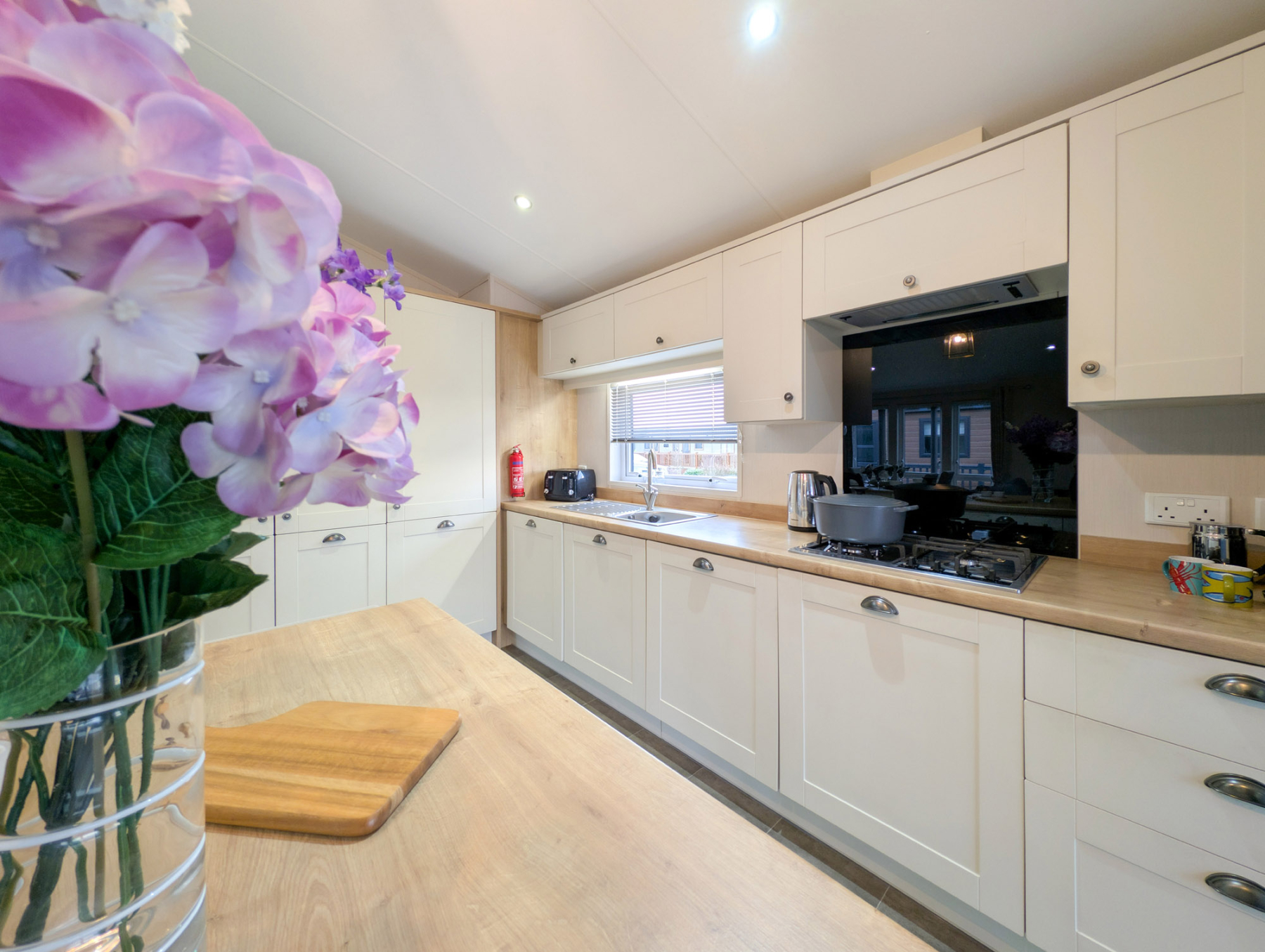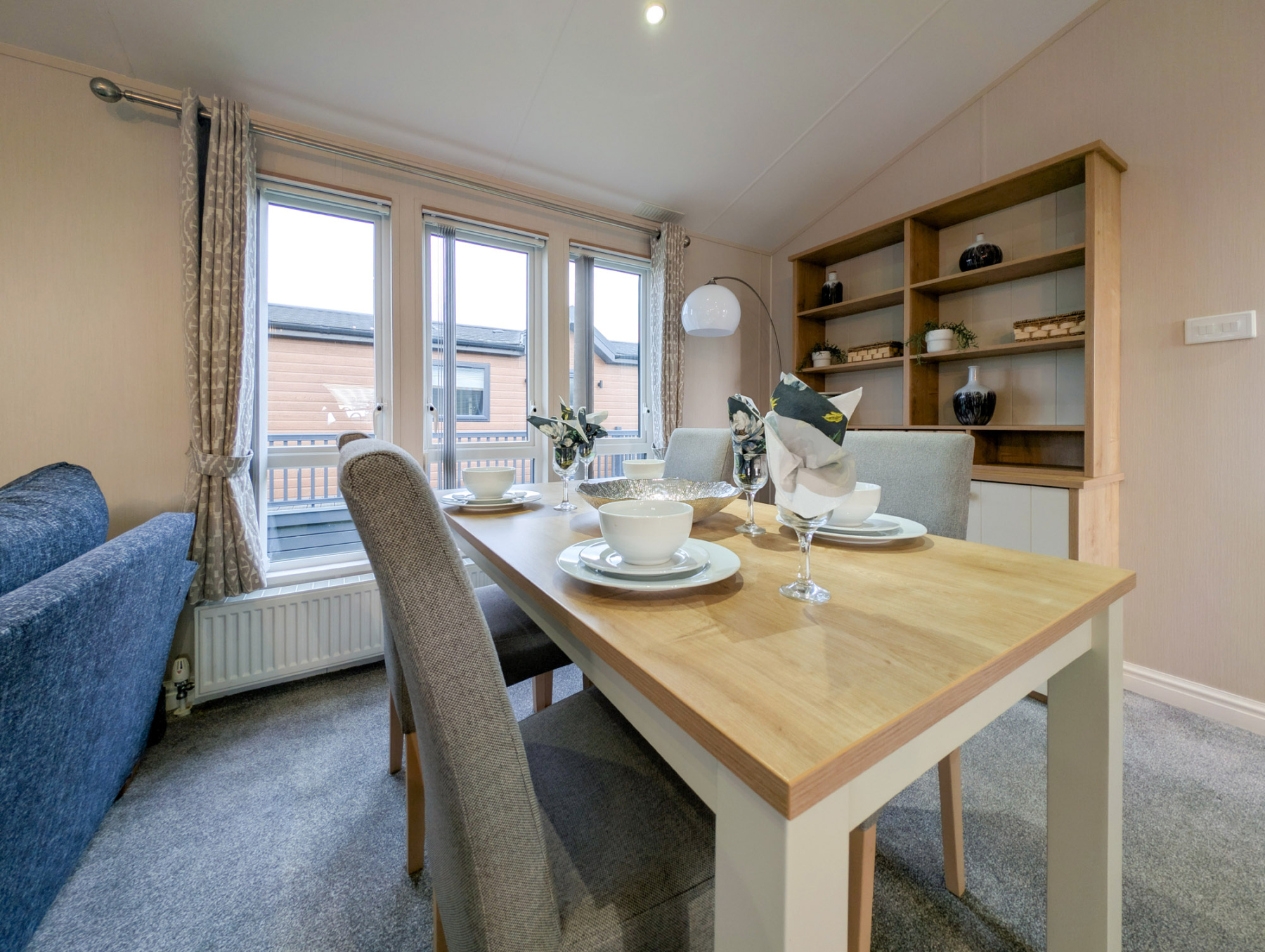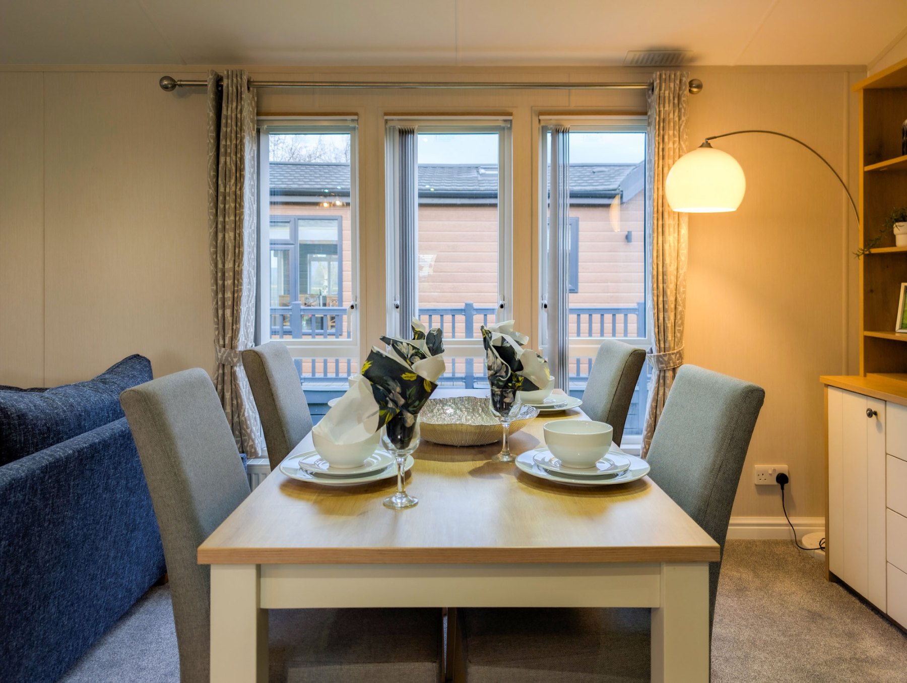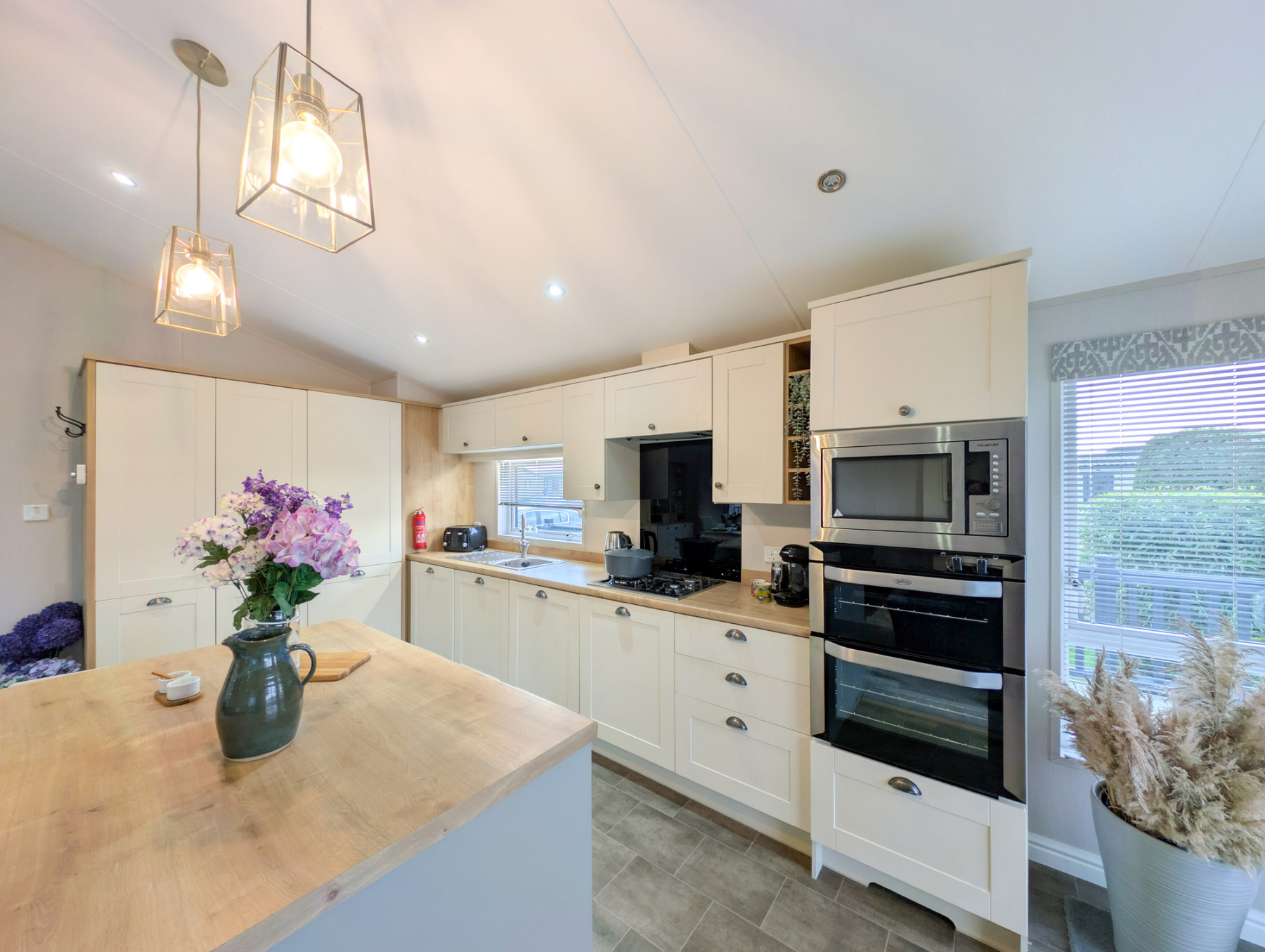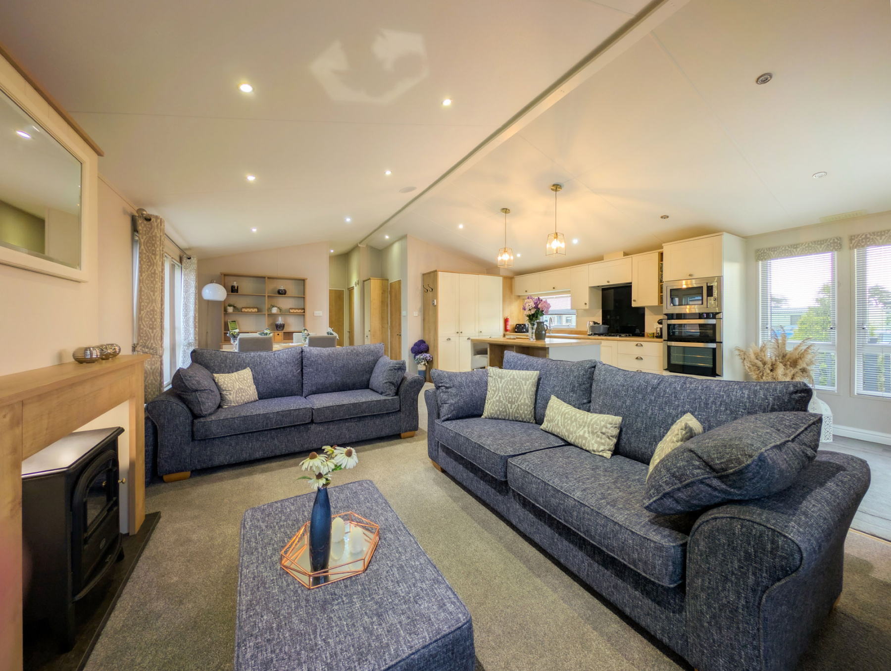 Discover the pinnacle of holiday home luxury with the Willerby Pinehurst lodge. A spacious 40ft x 20ft retreat designed for ultimate comfort and elegance. Offering a sophisticated open-plan living experience. The heart of the home features a well-appointed kitchen with integrated appliances, a stylish central island, and a double-width pantry, perfect for culinary enthusiasts. Furthermore, the adjoining dining area boasts a freestanding table and a chic furnished lounge with electric log burner style fire. Also, expansive windows and a sliding patio door flood the space with natural light and provide seamless access to your private decking which overlooks Whitbarrow Scar.