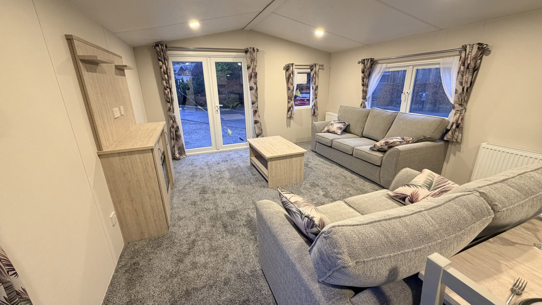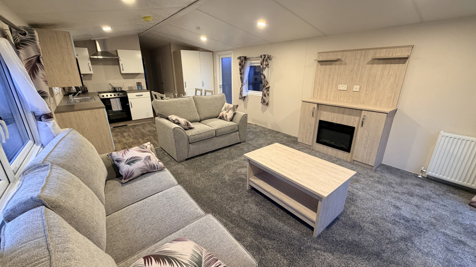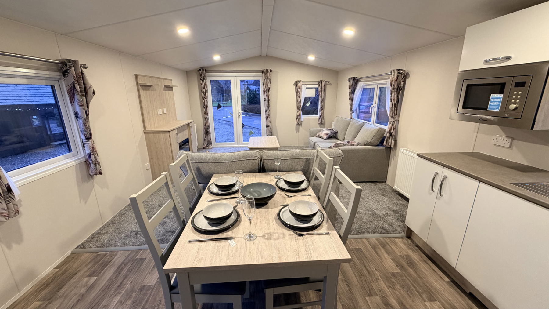 With front French doors, the Saffron Deluxe offers modern, open plan design, ideal for spending quality time with family and friends. Free standing sofas and dining table and chairs along with a well-equipped kitchen, including integrated appliances, continue the modern styling. This thoughtfully designed holiday home provides exceptional value for money, guaranteed to exceed expectations.