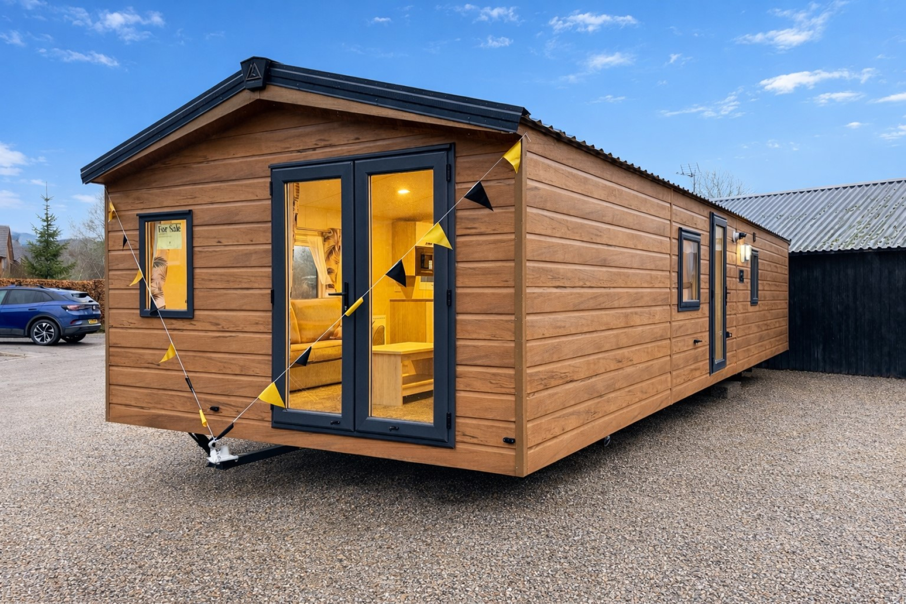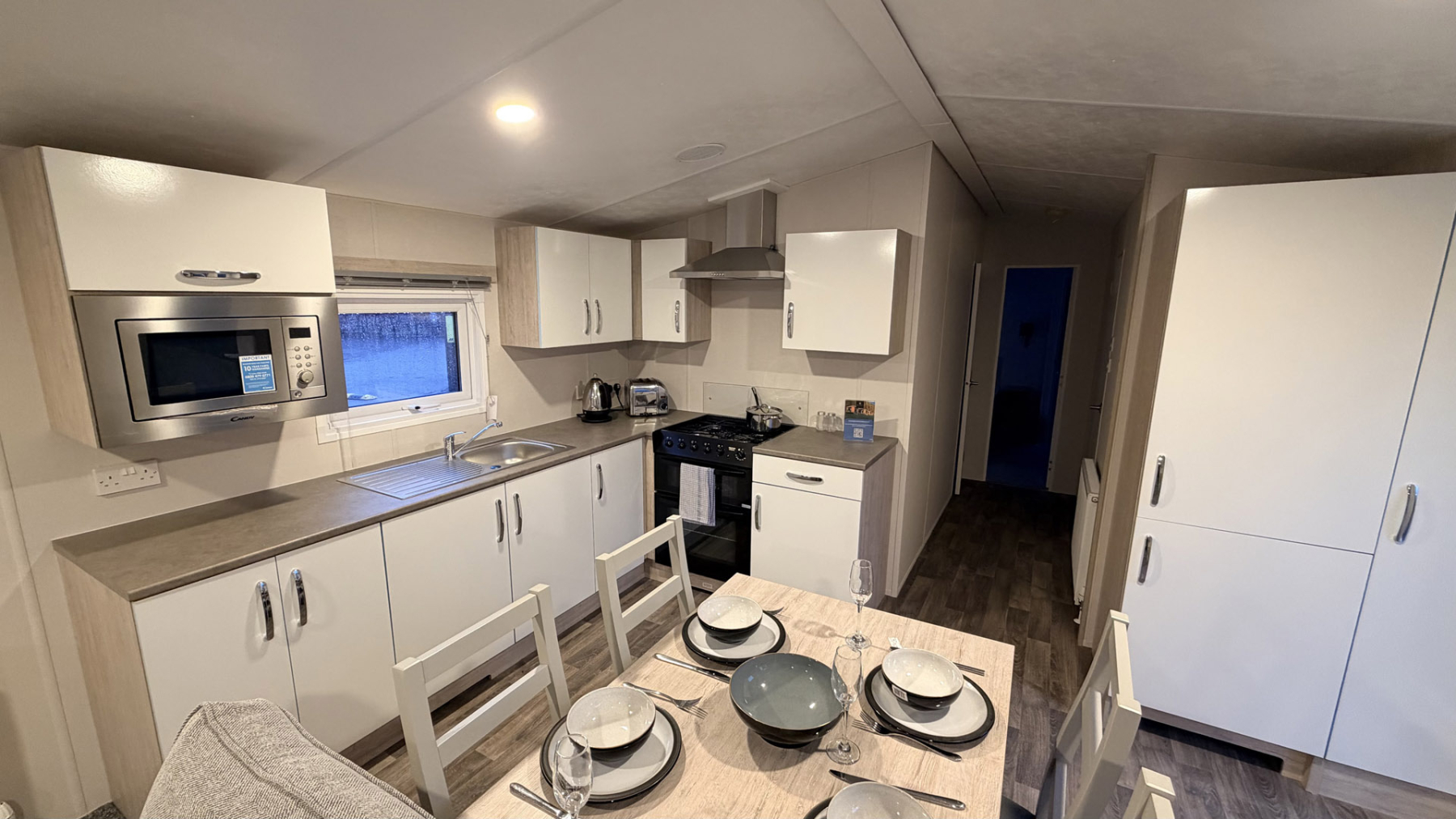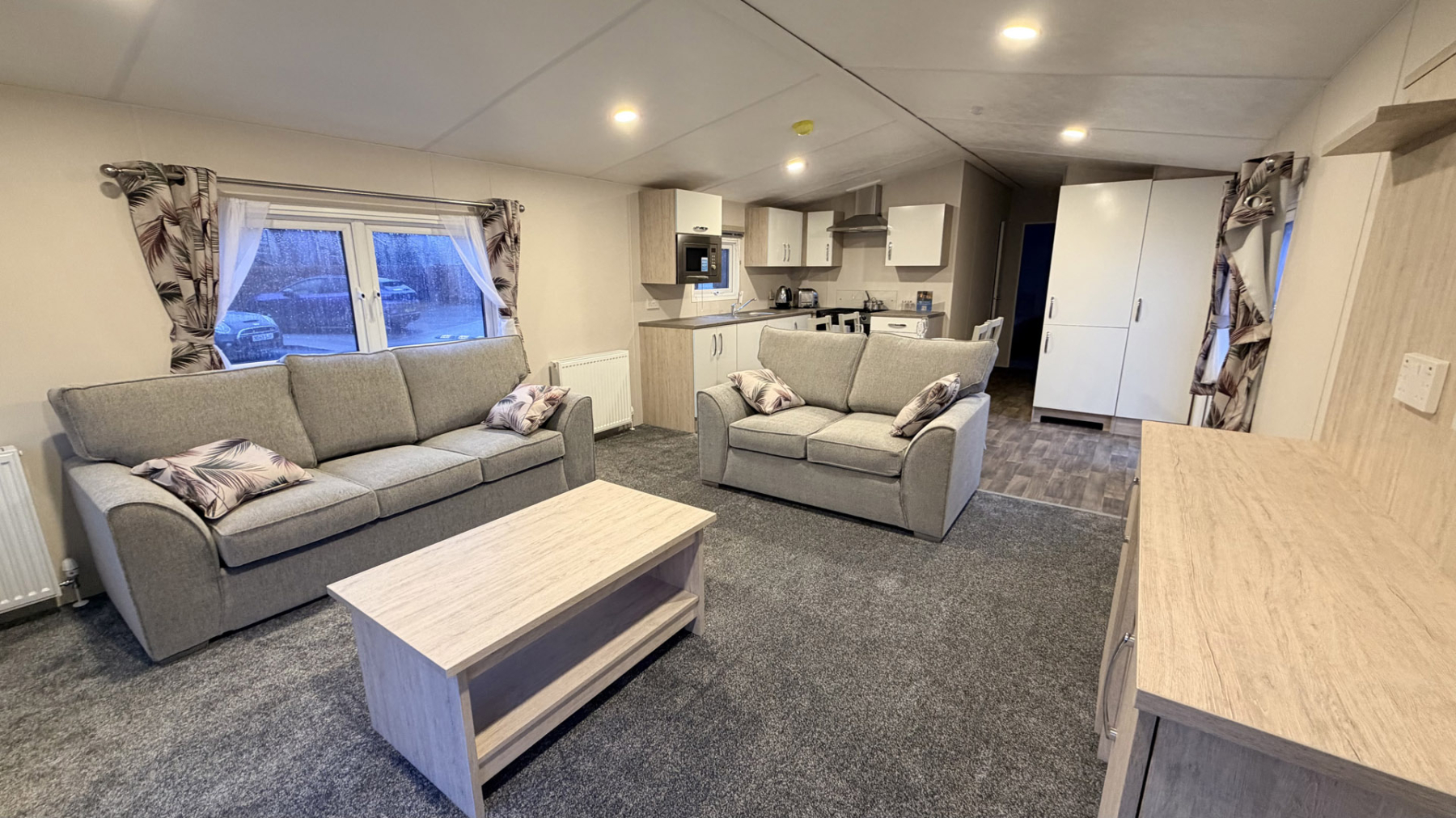 With front French doors, the Saffron Deluxe offers modern, open plan design, ideal for spending quality time with family and friends. Free standing sofas and dining table and chairs along with a well-equipped kitchen, including integrated appliances, continue the modern styling. This thoughtfully designed holiday home provides exceptional value for money, guaranteed to exceed expectations.